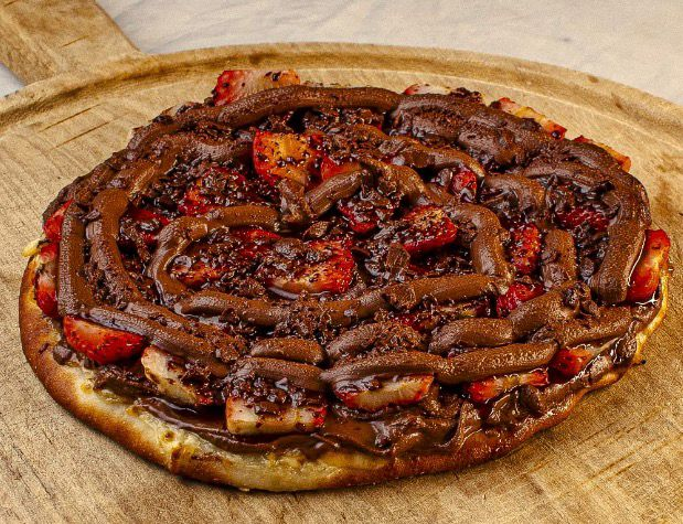 Massa sem glúten. Creme de leite zero lactose, um toque de queijo muzzarella zero lactose, brigadeeiro preto zero lactose finalizado com fatias de morango. Tamanho broto - 20cm.