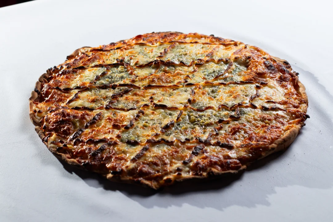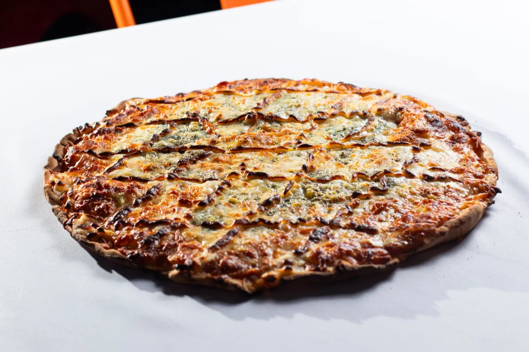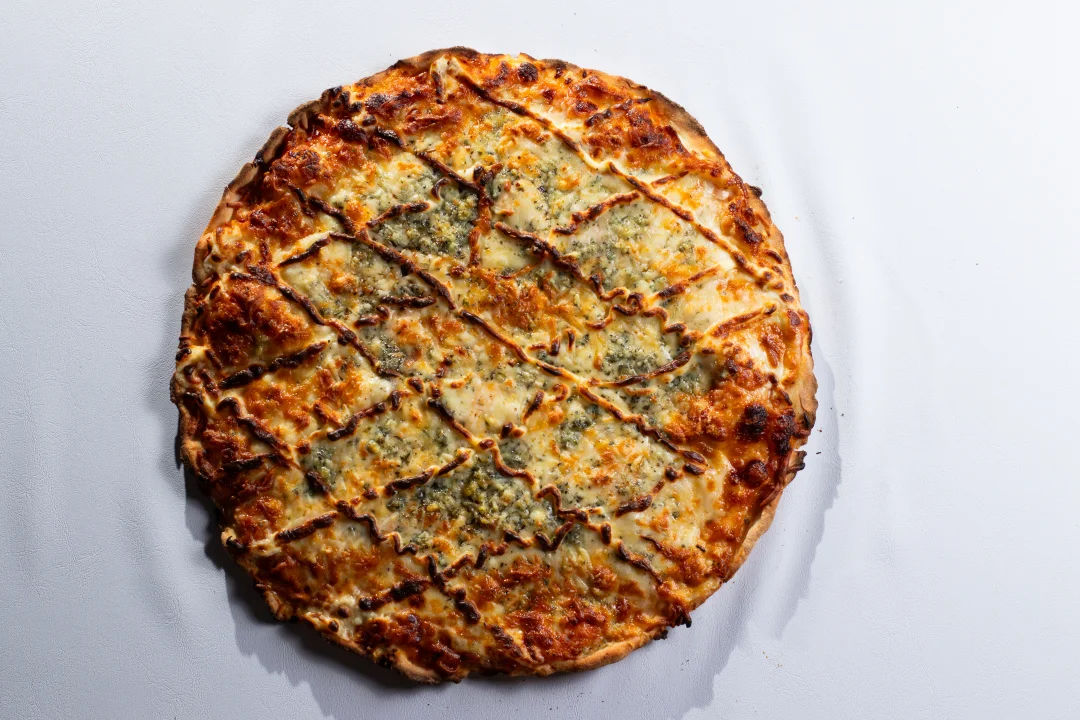 Massa sem glúten. Molho de tomate pelati, queijo muzzarella zero lactose, parmesão zero lactose, provolone zero lactose, gorgonzola zero lactose e orégano. Tamanho G - 8 fatias - 35cm.
