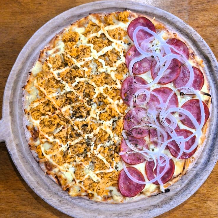 Massa sem glúten. Molho de tomate pelati, queijo muzzarella zero lactose. Meia calabresa fatiada, cebola e orégano; meia frango, catupiry zero lactose e orégano. Tamanho G - 8 fatias - 35cm.
